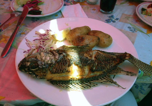 Сегодня у нас на обед рыба «святого Петра» - трапеза, которую совершают паломники в рыбном ресторанена берегу Галилейского моря (озеро Кинерет) в воспоминание о том, что первые ученики Христа были рыбаками, но Он сказал им: «идите за Мною, и Я сделаю вас ловцами человеков».