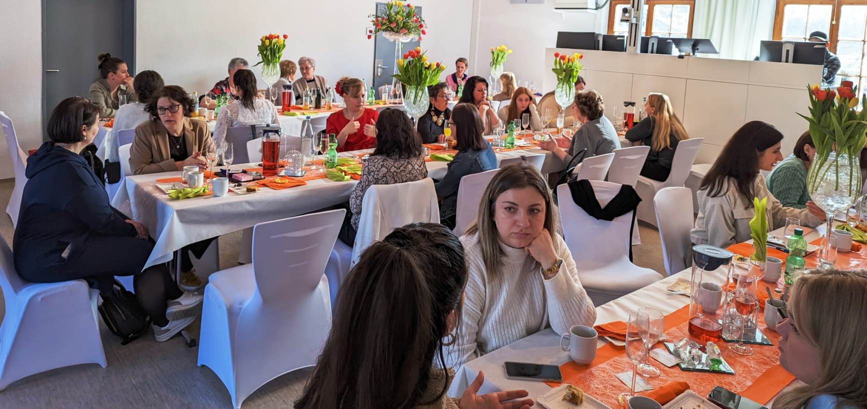 Нас ждал великолепно украшенный зал, весенние цветы и конечно непринуждённая обстановка. Было видно, что братья и сёстры этой церкви постарались всё сделать с любовью и с радушием принять всех гостей, что у них, надо отметить, очень хорошо получилось. Спасибо им за эти старания!