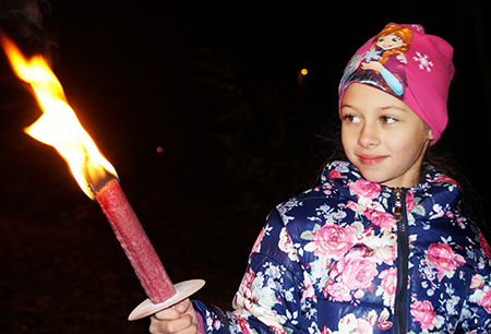 Ну и наконец, когда уже стемнело, к большой детской радости, все отправились в совместное путешествие, взяв с собой свои фонарики. Дети постарше ( они ведь уже постарше) получили взрослые факелы и освещали ими нам путь.